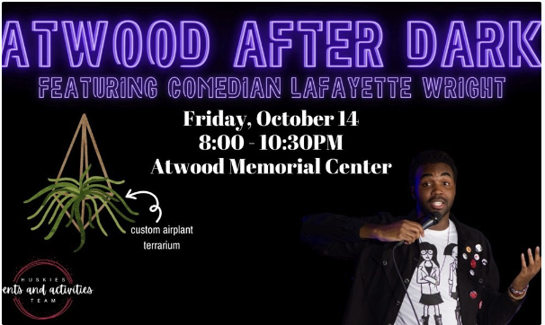 Lafayette Wright is an enigmatic loner offstage, Lafayette has spent close to a decade honing his skill as a favorite on the DC Comedy scene. He now divides his stage time between DC and New York City. Come have fun with your fellow Huskies on Friday, October 14th starting at 8 p.m. in the Atwood Center.