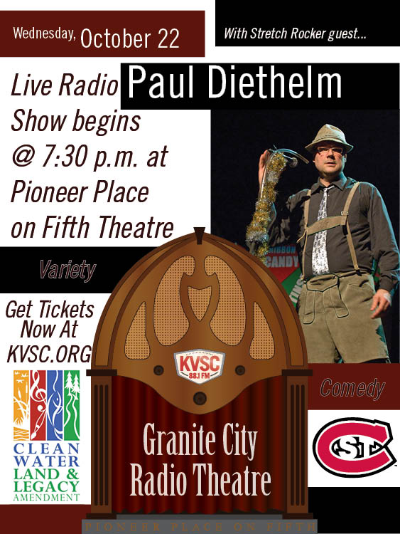 In this exciting first hour of the Granite City Radio Theater Season 3 Premier on October 22, 2014, the action is explosive as Paul “Stretch Rocker” Diethelm joins Collective Unconscious as special musical guest. Also, the gang of Shade’s Brigade begins an epic quest to save Christmas. Then Sven, Ole, and Lena discover the power of bacon through Toby the Strong. And finally, our Trivia Challenge pits Teresa Bohnen of the St. Cloud Area Chamber of Commerce, Director of SCSU Athletics Heather Weems, and musical guest Paul Diethelm against each other for a pumpkin overflowing candy.