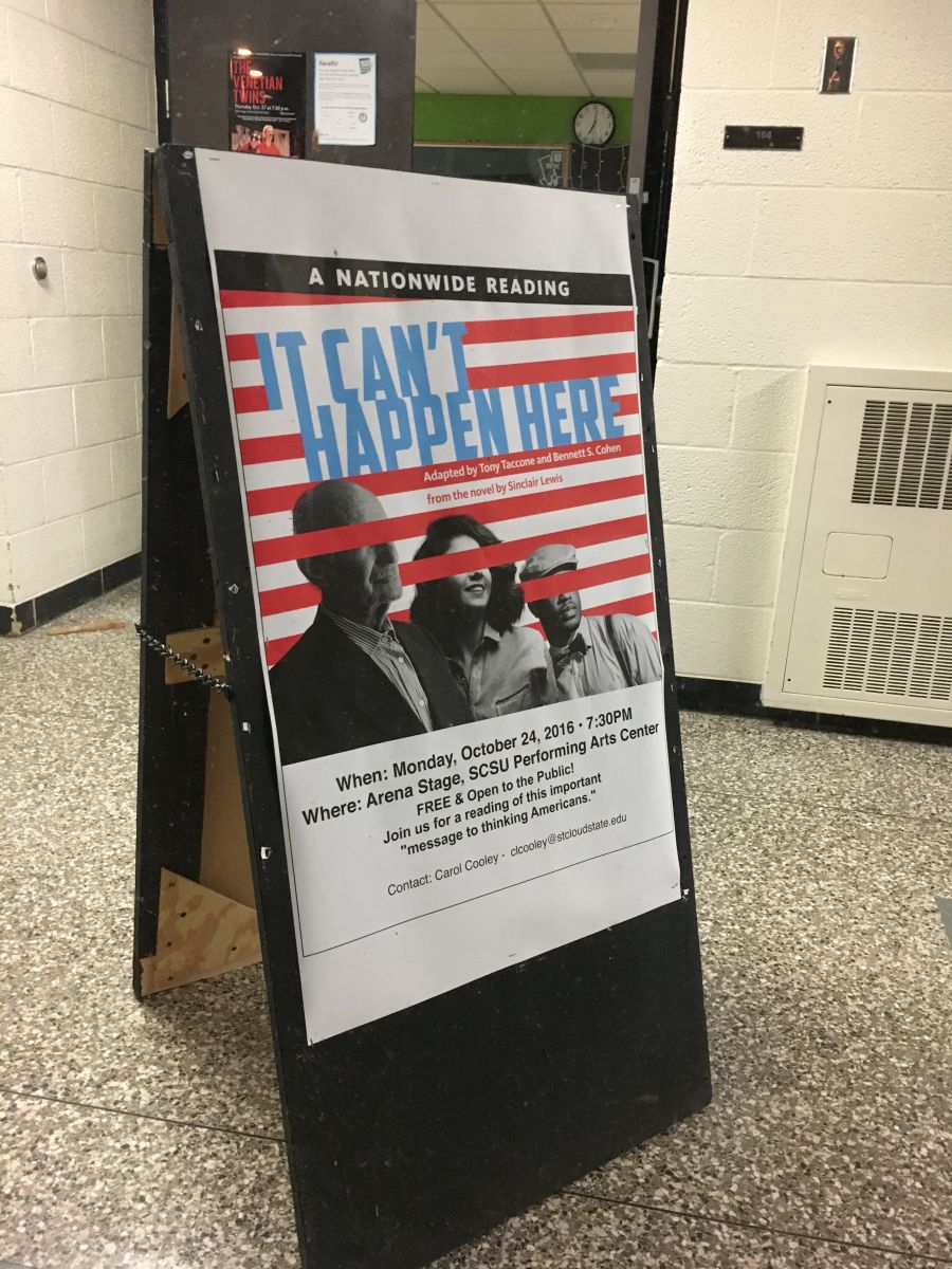 This performance of Sinclair Lewis‘ It Can’t Happen Here on the evening of Monday, October 24, 2016, on St. Cloud State University’s Arena Stage was hosted by Department of Theater and Film Studies and coordinated with the Berkeley Repertory Theater as part of a National Night of Readings.