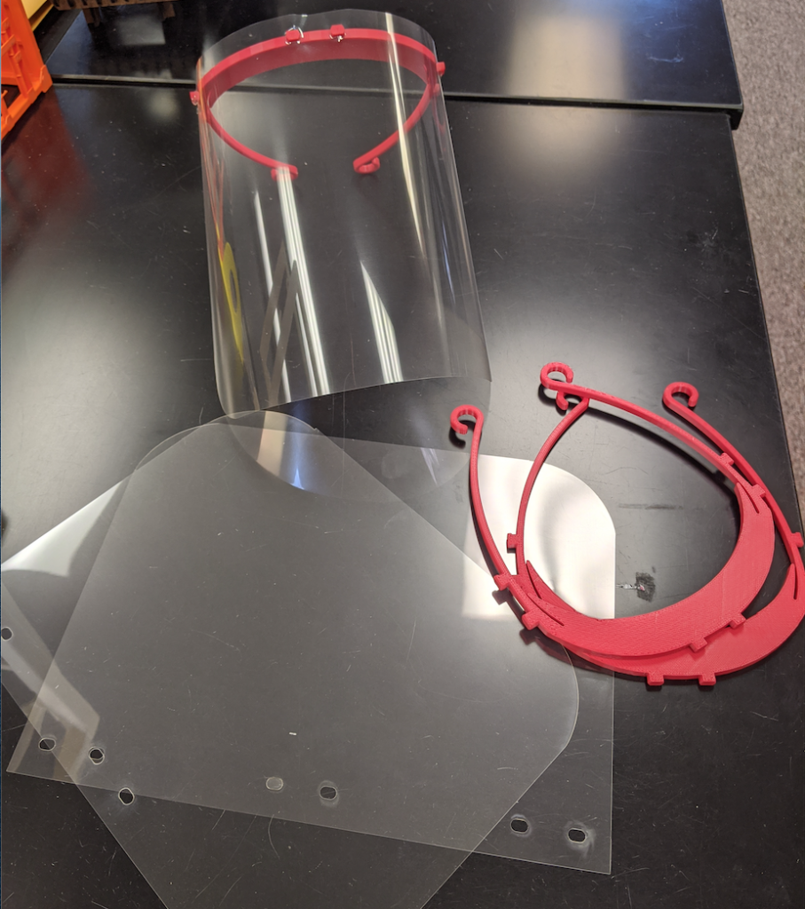 This is how the university’s faculty team are making the face shields. They are using the 3D printers to generate the plastic framing, then they’re cutting transparencies out with laser engravers.