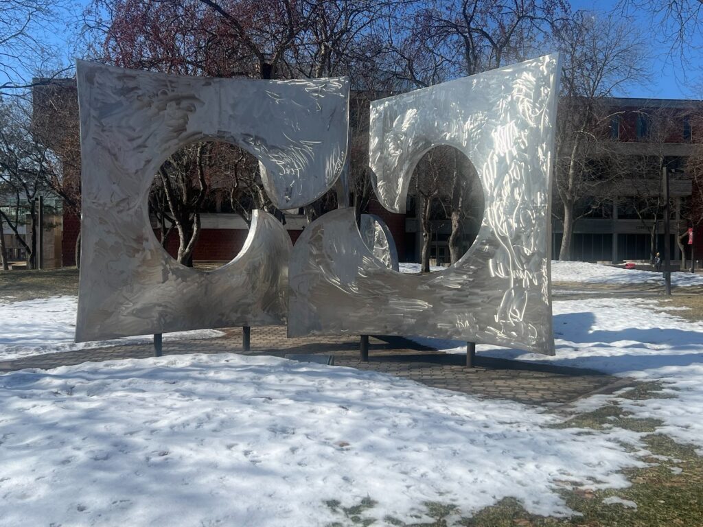 Just outside Stewart Hall stands a large outdoor steel sculpture called “Perspectives” that was created by Charles Huntington. The sculpture is 12 feet tall and 18 feet wide, and can be viewed from different angles. As people walk around it, the shape and lines look different, which is how it earned its name.