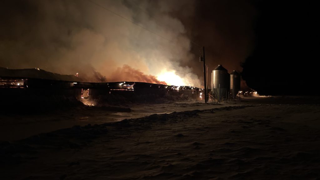 Several local fire departments were dispatched to help put out the blaze. The 60-foot by 600-foot barn was estimated to be a total loss. Fortunately, the barn had been emptied about two weeks prior and there were no animals in it.